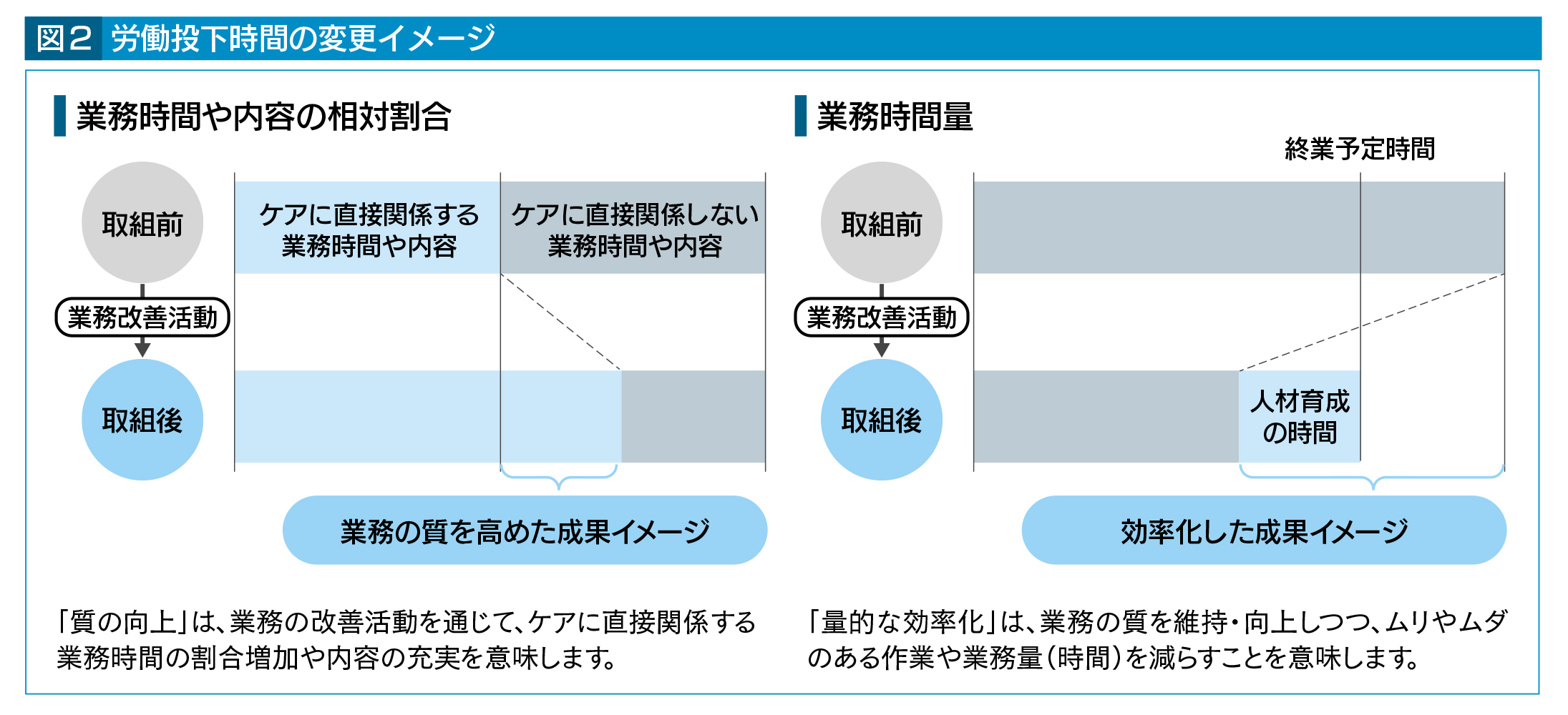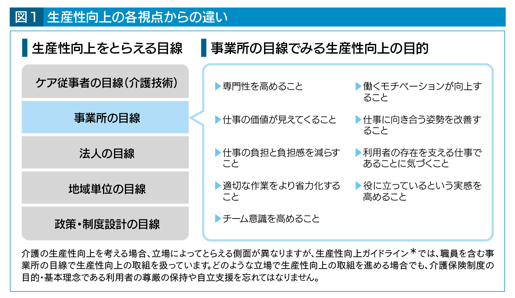 しかし、介護現場における生産性向上を取りあげても、職員の視点によって、もつイメージが異なることは見落としがちなようです(図1参照)。一般的な生産性向上では、いかに従業員および労働時間数あたりの付加価値額を、設備投資や労働の効率化などによって向上させることができるかをはかります。介護事業所でいえば経営陣が「生産性が上がった」ということは「収益性が向上した」ことにほかなりません。少ない職員で事業所を運営していくことが結果につながります。一方、介護現場のリーダー層においては「介護の質を担保し、あわせて職員の負担感を軽減する」ことが目的となり、職員はといえば「利用者とかかわる時間を増やすことができた」ことが生産性向上の実感として感じやすいでしょう。リーダー層と介護職員の生産性向上とは人員が手厚くなれば解消する側面を持ちあわせています。つまり、介護現場のリーダー層は「収益性と職員の労働時間減(ここでいう労働時間はいわゆる介護業務への投下時間を指します)」両面の視点を持つことが求められているのです。介護現場のリーダー層はかつて介護職員であり、その働きが評価されリーダー職を任命されていることが多く、自分がリーダーになったら現場の役に立つリーダーでありたいと望み、自身の考える理想の動きをしていく傾向にあります。しかしそのリーダー像は介護職員であった視点から抜け出さないままのイメージが色濃く残っており、職員の負担軽減のために介護の現場に積極的に入り、リーダー職になったからという理由で帳票類の作成管理を一手に引き受けてしまいがちです。ここで見落としている視点は、リーダー職になっても自分の使える時間は介護職であった場合と同じであるという視点です。
