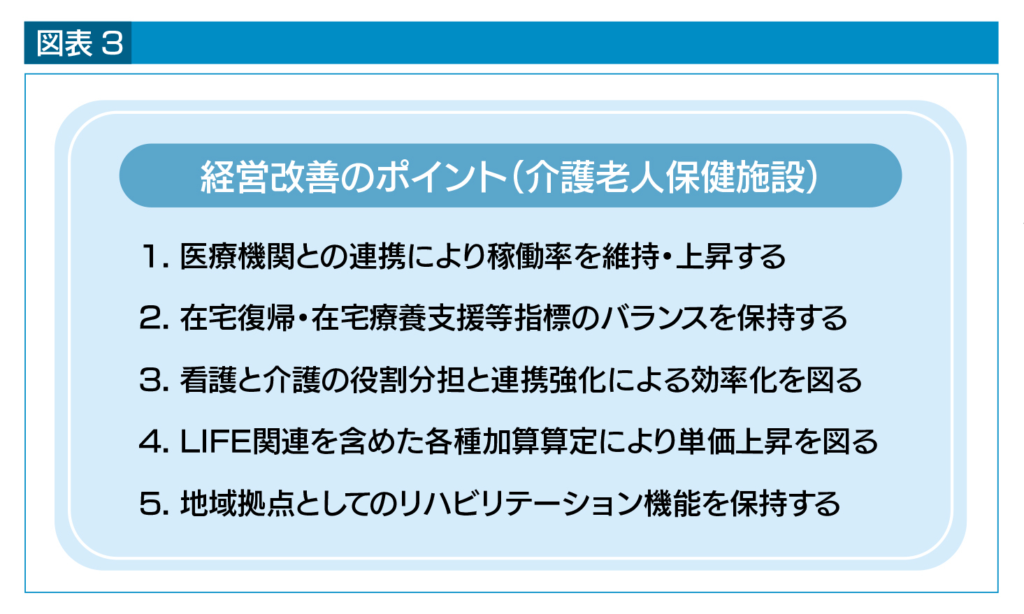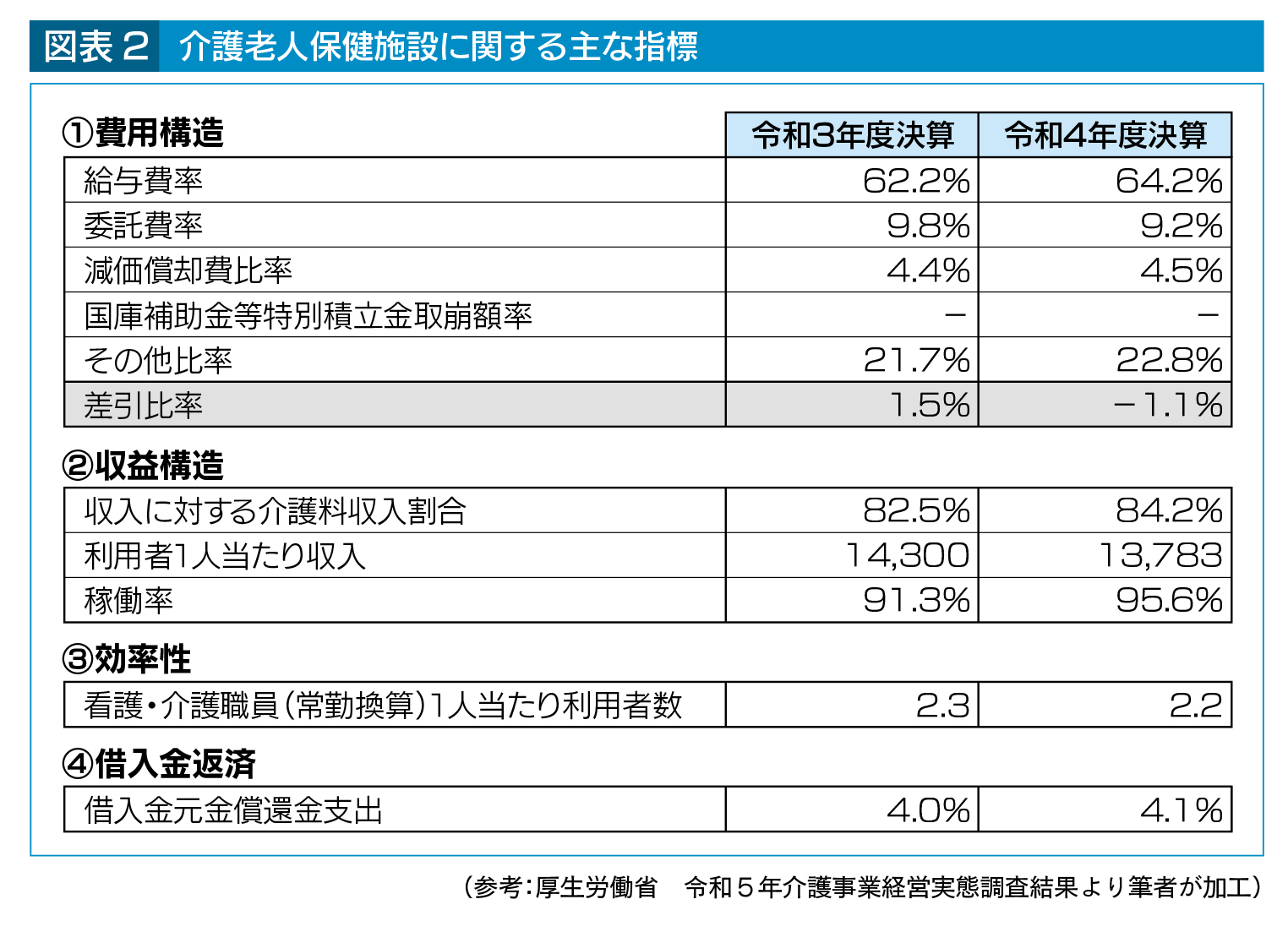 2024(令和6)年度の介護報酬改定に向けた介護事業経営実態調査結果(図表2)では、介護老人保健施設では、2022(令和4)年度決算において平均差引比率が赤字と発表されました。黒字であった前年度と比較すると看護・介護職員(常勤換算)1人当たり利用者数が低下、つまり職員数が増加し、給与費率が上昇しています。その結果、差引比率がマイナスに転じています。その状況から前回の改定では基本報酬等の見直しが行われ、比較的収益回復の傾向にあります。