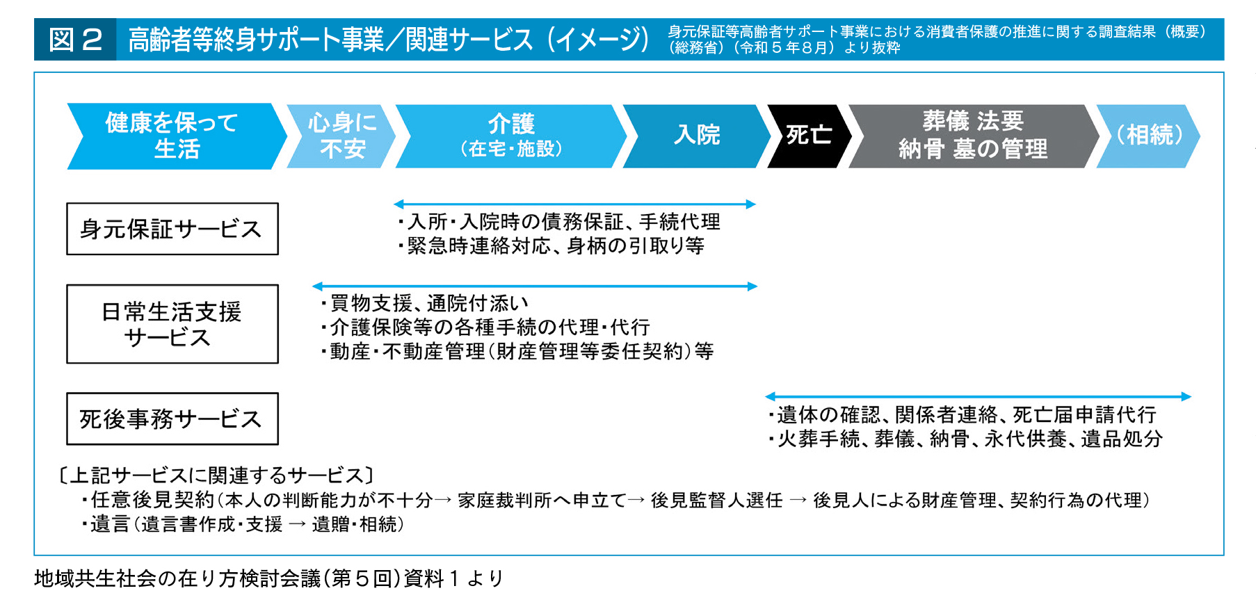 頼れる身寄りがいないことにより抱える生活上の課題(図1参照)への具体的な対応として、いわゆる「高齢者等終身サポート事業」は対応策の一つであるが、費用が高額になることもあり、一定程度の収入・資産がなければ利用が困難等の課題があるため、資力が十分にない人も利用できる事業が求められている。また、そうした事業は、資力の有無にかかわらず利用できるようにするべき、との指摘もある。