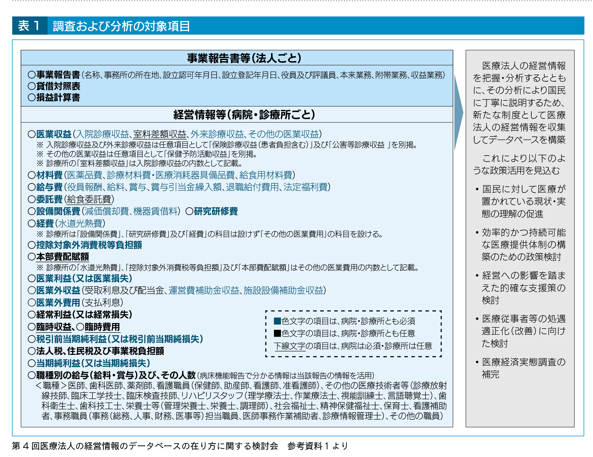 こうしたことから、政府方針等でも医療法人の経営情報の収集とデータベースの構築、国民への丁寧な説明が求められ、2023(令和5)年の医療法改正により、@医療法人の経営情報の収集およびデータベースの整備、A収集した情報を国民にわかりやすくなるよう属性等に応じてグルーピングした分析結果の公表、B医療法人に関するデータベースの情報を研究者等へ提供する制度の創設が行われている。