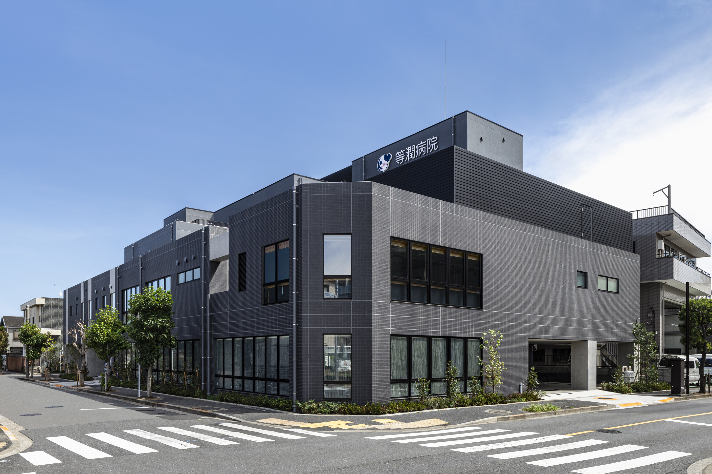等潤病院の向かいの敷地に建築された「等潤メディカルプラザ」は、同院に併設していた健診センター、腎センターを移設して機能強化を図るとともに、地域に不足する緩和ケアセンター(緩和ケア病棟20床)を新設。さらに、在宅医療やリハビリ機能を強化するため、在宅診療所をはじめ、通所サービスのデイケアやデイサービス、居住サービスの有料老人ホームを併設している。高度医療から在宅医療、健康増進、緩和ケアまでをシームレスに提供することにより、法人理念に掲げるトータルヘルスケアの実現を目指している。